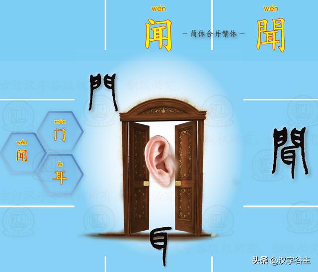 【聞】:聞聽。門耳為聞,“門”象雙扇門形,表示門可開;“耳”象耳朵形,表示耳聽。二者合一,“耳”可聽聲訊傳入“門”開之內(nèi)為“聞”聽見聲。